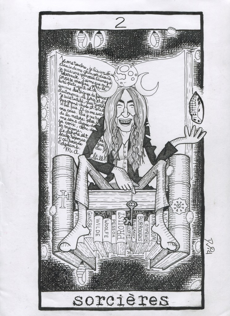 J’ai parlé de l’improductivité de la figure des Sorcières. Celle de l’arcane est effectivement peu industrieuse, mais elle est hautement génératrice de sens. Elle est une figure de désobéissance et d’insubordination à l’injonction de produire, produire toujours, toujours plus. Elle est l’immobilité vitale à adopter face à une machine mortifère qui s’emballe vers la production exponentielle des biens, des rêves et des cauchemars du capitalisme… Cauchemars ou réveil? Réveil brutal où toute vie est extirpée de la nature, après avoir été extirpée de la nature humaine, qui s’est faite ouvrière. La figure des Sorcières, c’est la « beauté improductive » de la poésie dont parle Véronique Côté dans La vie habitable. C’est une fécondité spirituelle qui peut très bien se revendiquer nullipare!