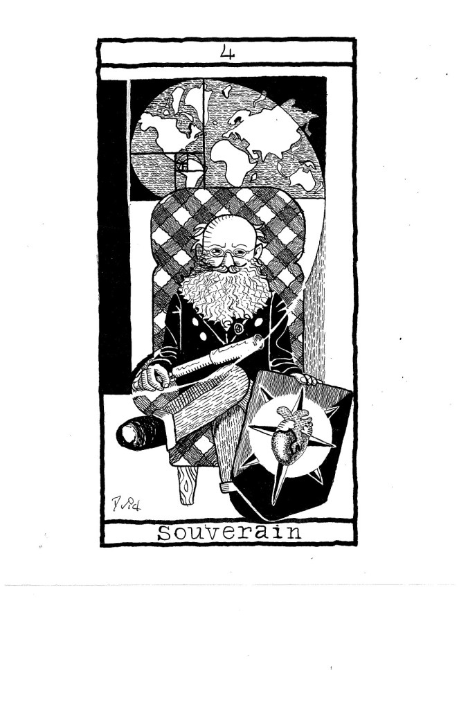 Dans ce tarot mutant, j’aime à penser que le pouvoir, c’est le pouvoir, sans l’empereur. Mais, répondront les interprètes de la ligne pure du tarot, l’Empereur ici n’est pas un tyran, au contraire, voyez plutôt : il n’a aucune arme et il tire sa légitimité de sa seule autorité morale. Rien n’est plus faux. Il n’y a pas d’empereur sans armée à son service, avec des armes bien réelle. Il n’y a pas d’empereur sans soumission, sans violence,sans écrasement de l’autre, sans usurpation de pouvoir, sans volonté de domination sur ses semblables.