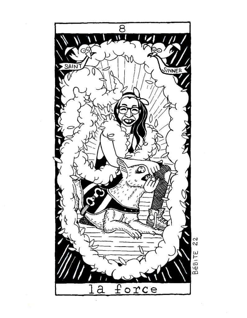 La figure du huitième arcane du tarot change selon les traditions. Pour le tarot de Marseille, il est représenté par la figure de la Justice ; dans le Rider Waite Smith, c’est la Force. Ce sont des circonstances plus qu’une allégeance à l’une ou l’autre école qui m’ont poussé à aller dans le sens de ce dernier. Même si en y réfléchissant, les mêmes circonstances auraient aussi bien pu me faire choisir l’autre.